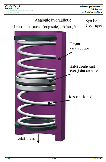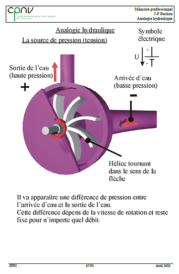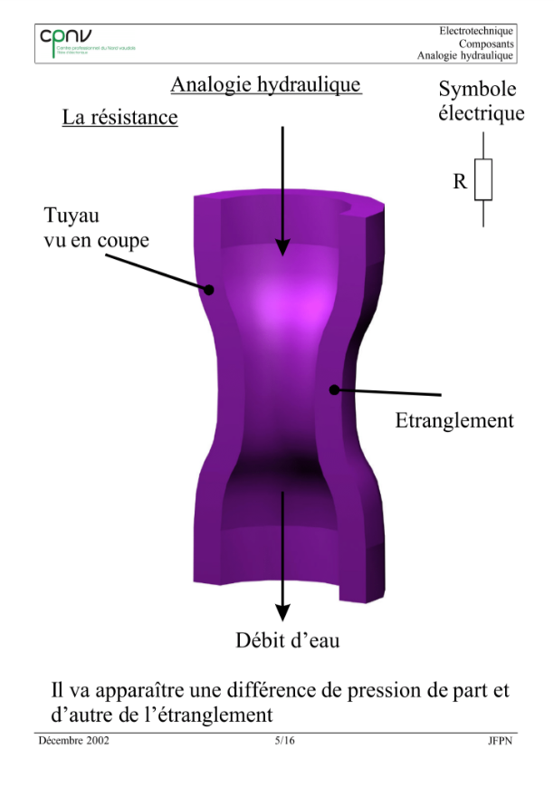 On peut imager le fonctionnement des éléments électriques à l'aide de tuyaux et d'eau. Le termes de courant par exemple suggère le flux d'électrons dans les fils, et il est tout à fait juste de le comparer au débit d'eau dans un tuyau.
